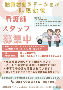 訪問看護ステーションしあわせは、福山市内ほぼ全域にわたり訪問看護サービスを展開しています。利用者様や介護者の方が24時間・365日いつでも安心して在宅生活が送れるようサポート体制を整えています。在宅ターミナルケアにおいては、年間10~20名の方の在宅看取りを支援しています。癌末期における緩和ケアや高齢者の自然な経過の中での看取りを通して「生きていてよかった」と思っていただけるように、時間を大切に共有しながら看護いたします。